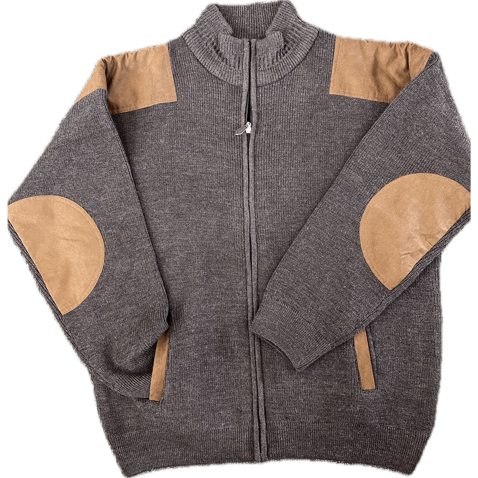 100% pure wool zip through cardigan with suede look patches on the shoulders, elbows and pocket edges.