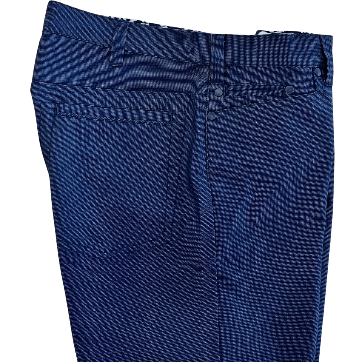Features a fine textured cross pocket style with a tapered leg just below the knee.