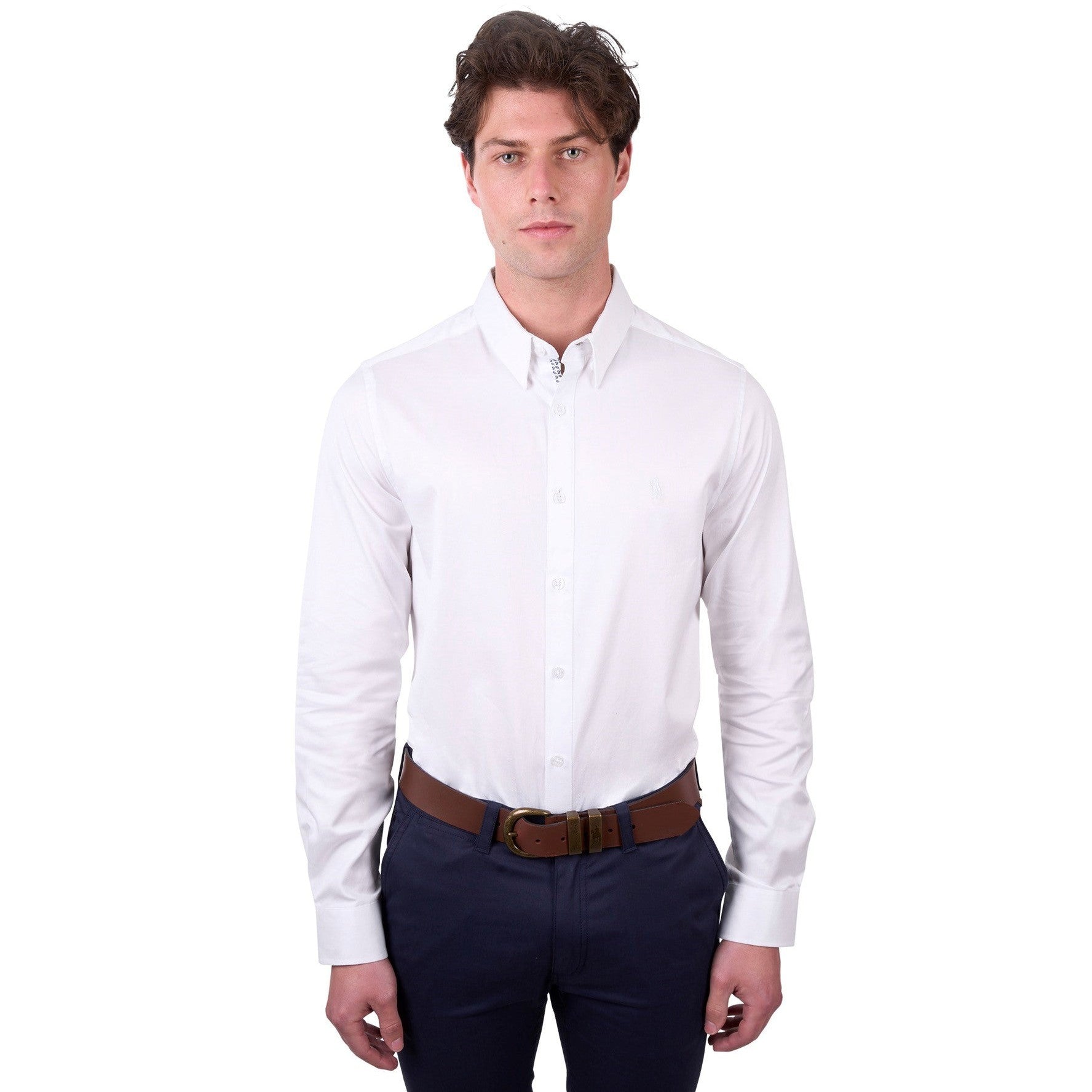 Featuring a concealed button-down collar and removable collar stays. There is a contrast subtle, patterned fabric on the inside yolk, cuffs and front placket binding.