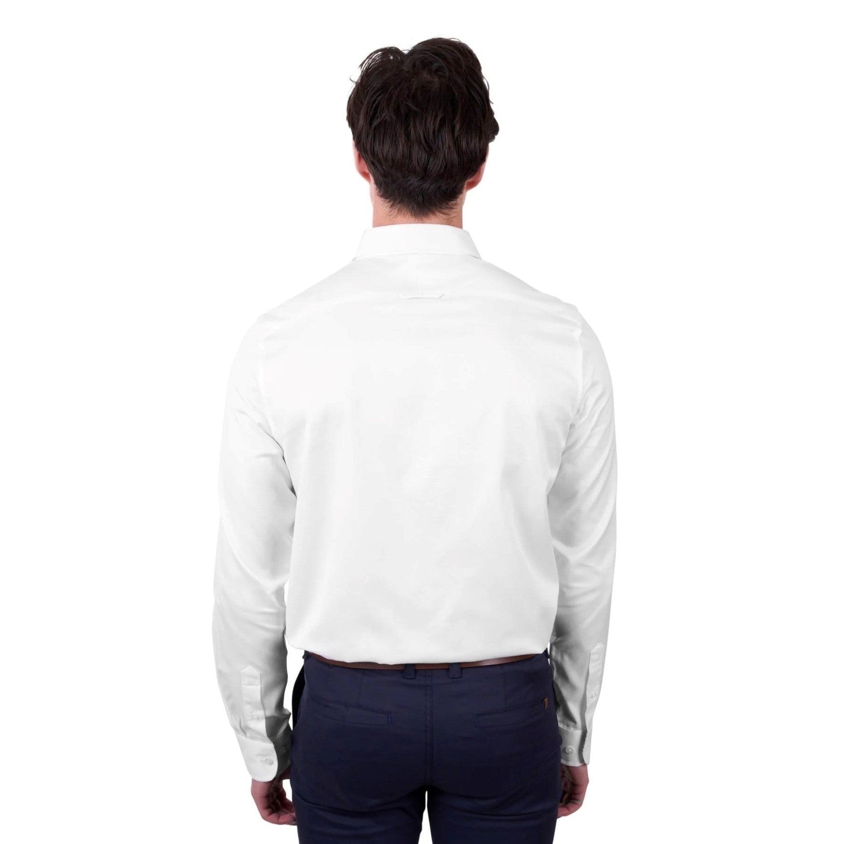 This tailored fit, long-sleeved shirt is stretch for comfort and is a premium woven fabric with a smooth sateen finish.